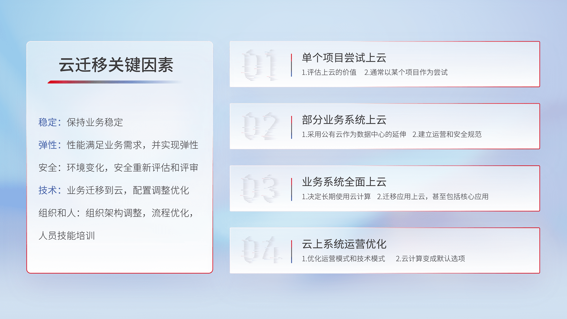 结合实际业务,,从规划设计、、、、云平台选型、、云原生改造、、数据迁移、、集成交付,,迁移全过程为客户识别最佳上云路径,,,,做好风险识别管理,,设计网络架构、、身份权限、、安全审计合规、、操作审计、、、日志审计、、监控告警策略、、多站点容灾设计等,,,,对云上基础设施进行整体规划,,提升IT治理水平,,,以满足弹性、、高可用、、、、高性能的需求。。。