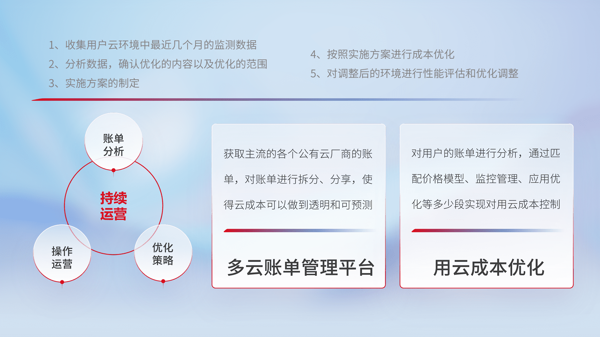 通过多云纳管,,,,以统一的资源数据模型把客户的云资源进行抽象和封装,,,进而实现对多云资源的统一操作,,,,保障云资源管理的可靠性、、、稳定性与可用性。。。。量身定制化运维内容,,,,配置、、、开发运维、、、补丁管理、、、备份、、、、监控、、认证和访问管理、、、审计和日常巡检等,,,保障在用云过程中的可靠度,,稳定度以及高可用率。。