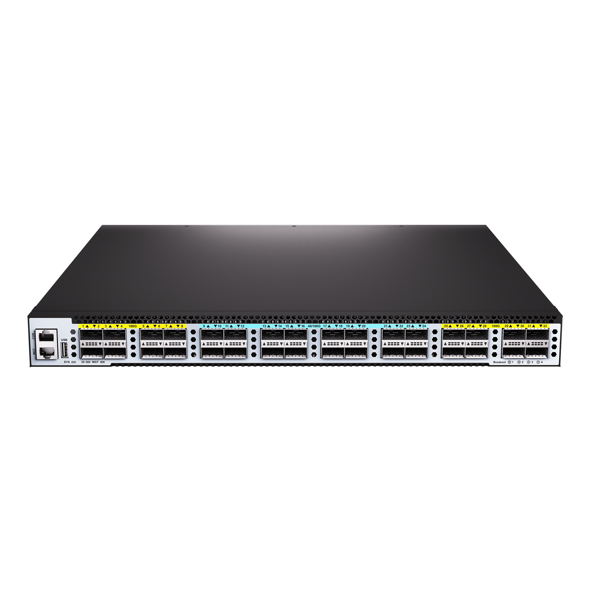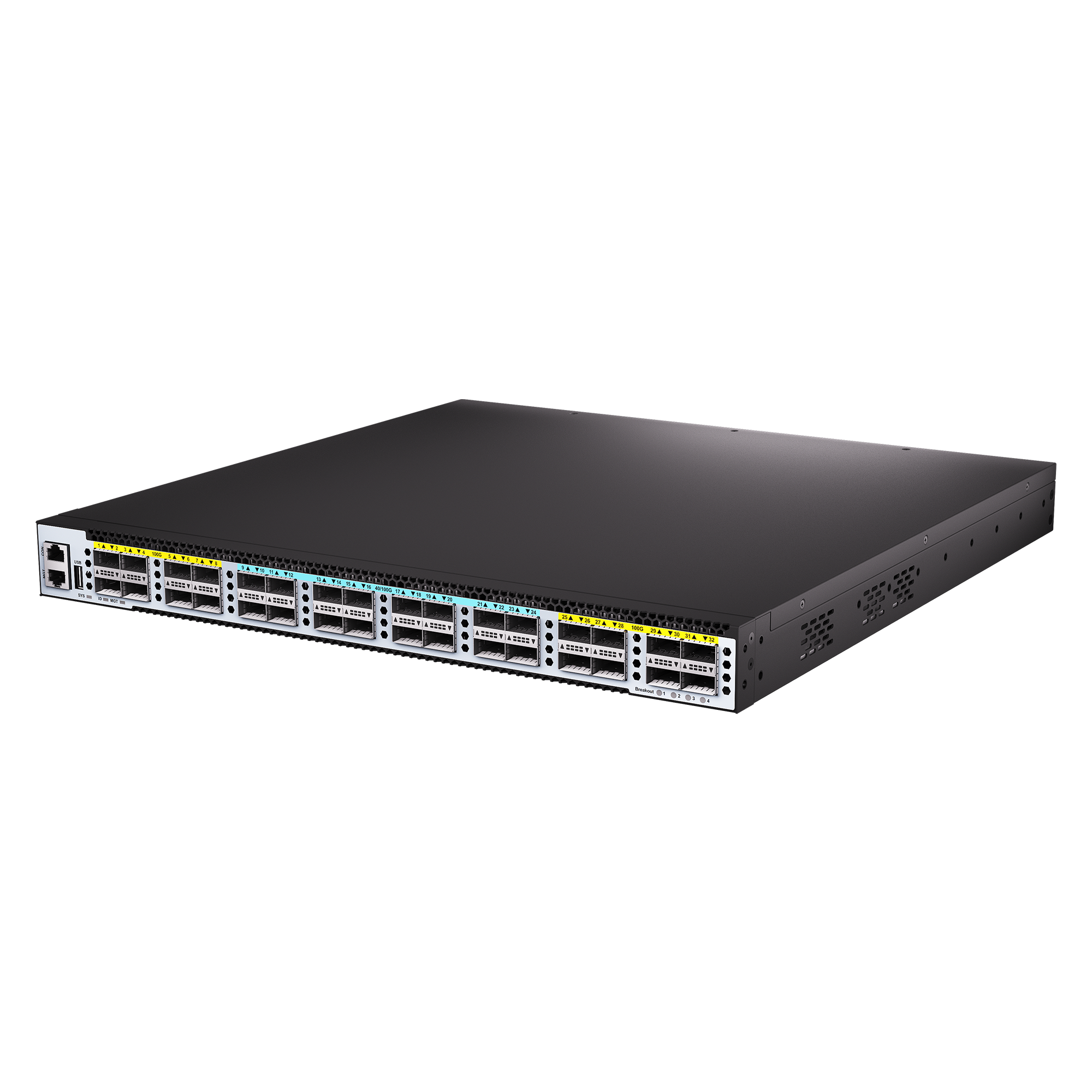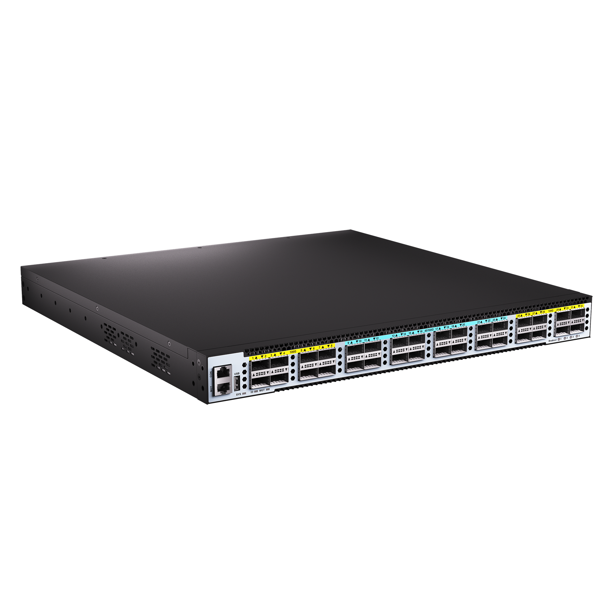 三层以太网路由交换机【1个CLI控制口,,1个带外管理千兆电口,,1个USB2.0接口,,32个100G/40G 光口(QSFP28封装,,,可适应40G QSFP+),,2个万/千兆SFP+光口;2个电源槽位,,标配2个AC220V电源;内置4风扇左右风道;1U标准机架式】;